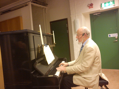 Vi hälsades välkomna av Rolf och festen tog sin början till pianotoner, spelade av kvällens underhållare Nils Backer, medan vi ”festare” försett oss med något lämpligt i våra glas.
