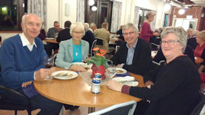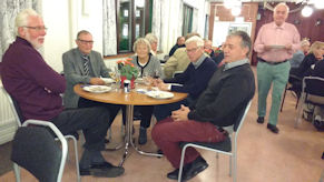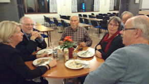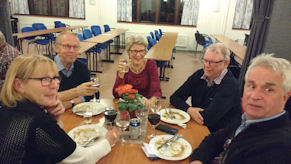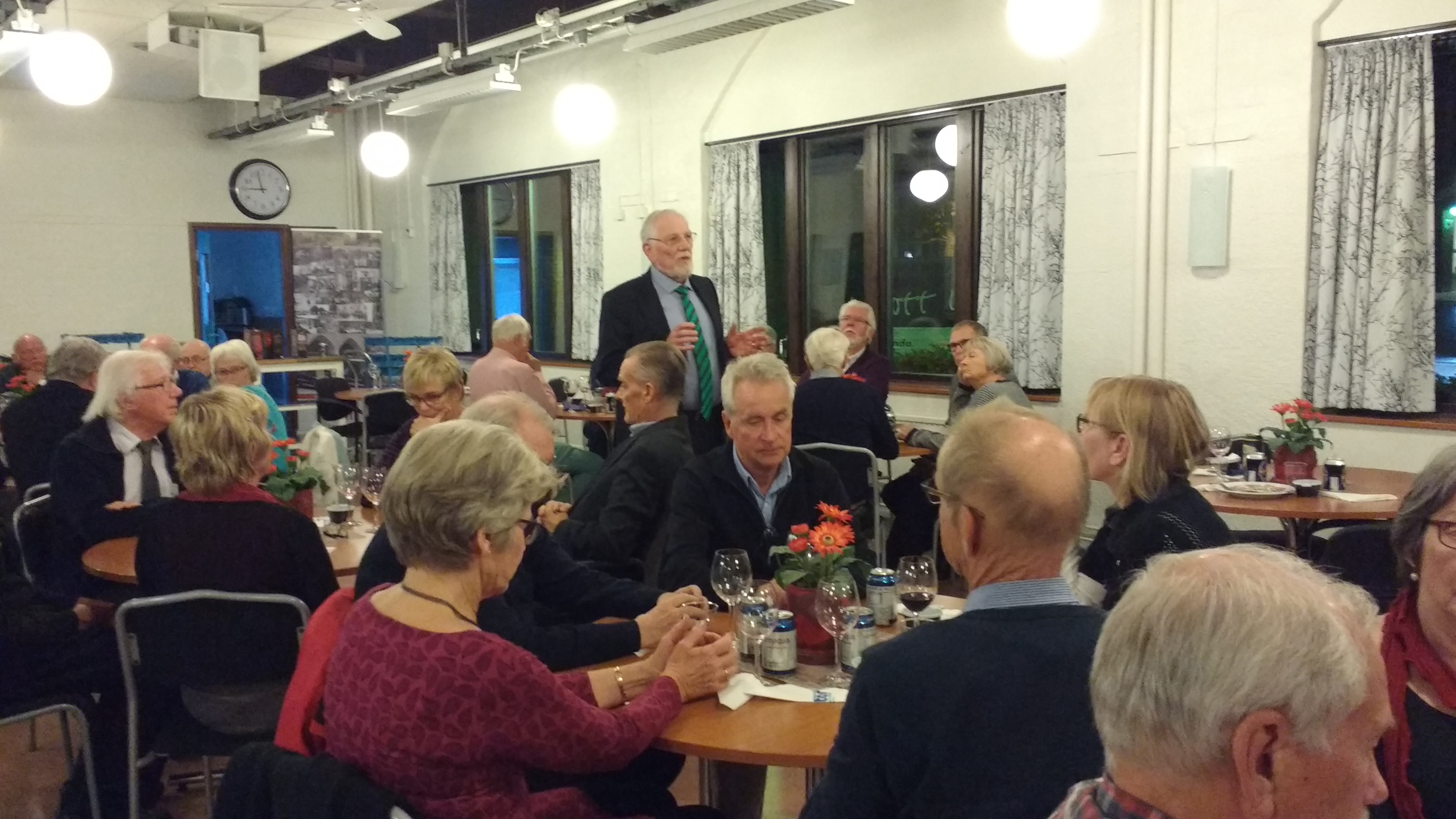 Efter Gunnar Elfströms underhållande föredrag var det dags att inta förrätten bestående av pocherat ägg på bacon och sjögräsbädd, och huvudrätten, örtmarinerat kalkonbröst med rostad potatis och rotsaker med svartavinbärsgräddsås. Kaffe med "Dammsugare" rundade av middagen.