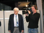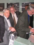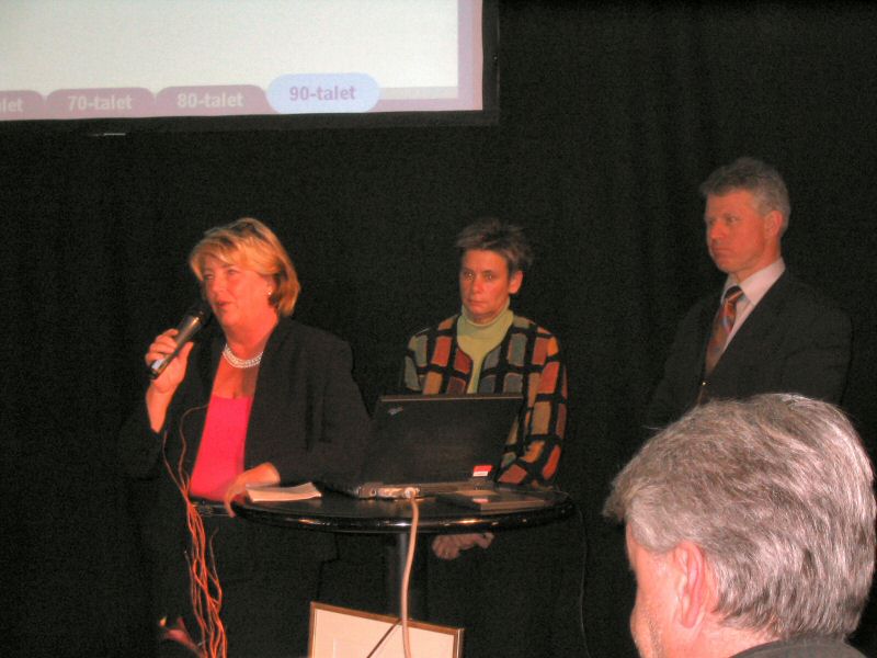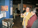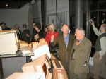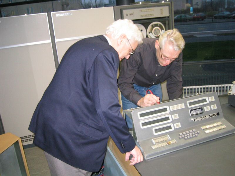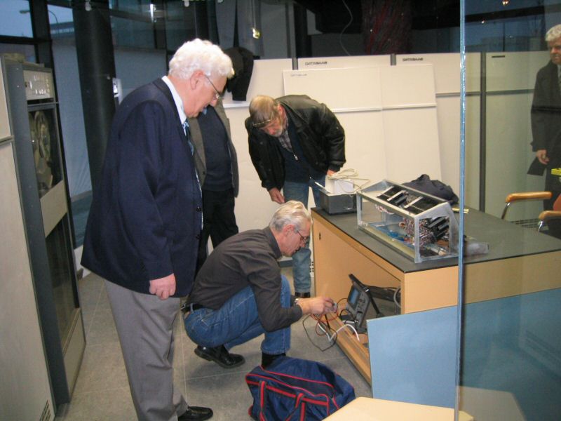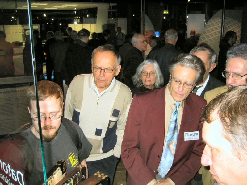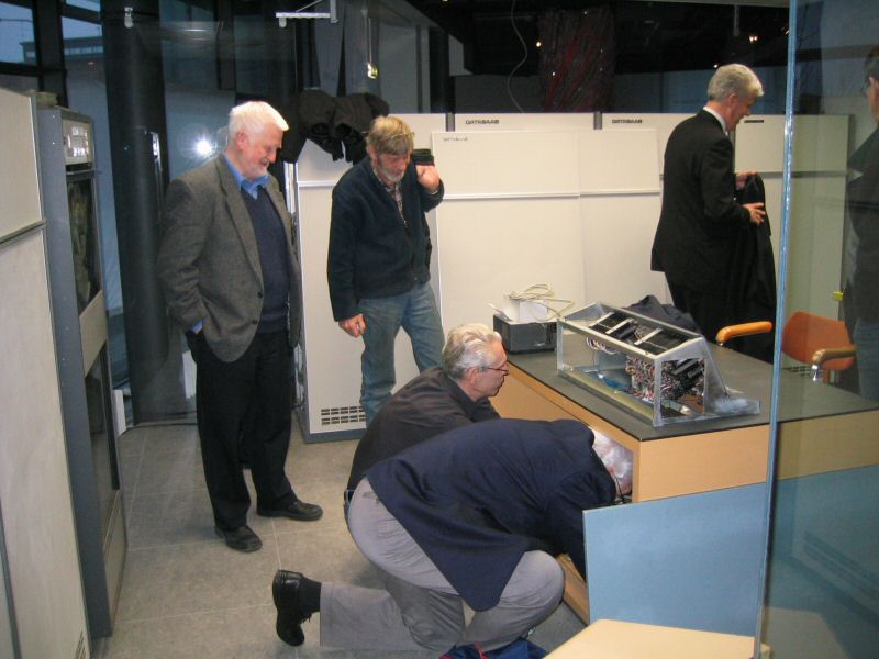 Thomas Höglund som en gång jobbat med BESK-datorn demonstrerade dess manöverpanel. Här tillsammans med Tord-Göran Hallberg och Fim Wästberg.